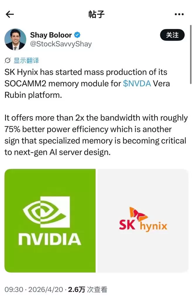 SK海力士量产SOCAMM2:为下一代AI服务器注入“关键缓冲” 近期,半导体行业传来重要进展。4月20日,据美国知名市场策略师Shay Boloor透露,SK海力士已正式启动面向英伟达Vera Rubin平台的SOCAMM2内存模块的大规模量产。这款新型内存模块性能表现卓越,不仅实现了带宽翻倍以上