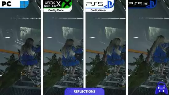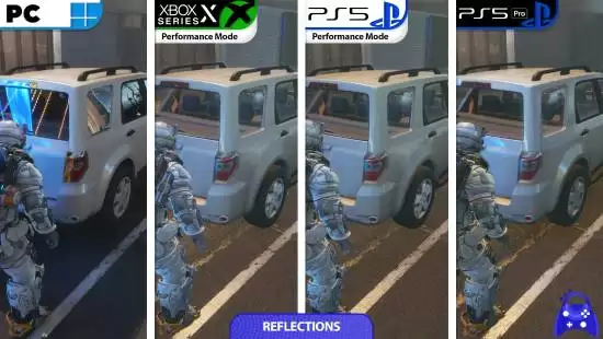 本次对比中最引人注目的变量是PS5 Pro。作为性能增强版主机,它确实是目前唯一支持解锁帧率运行的主机版本,但为了实现光线追踪效果,它也做出了一定妥协。由于光线追踪带来的性能开销,PS5 Pro的反射分辨率反而低于标准版PS5和Xbox Series X。在部分渲染压力较大的场景中,其内部动态分辨率甚至也会低于基础型号主机。