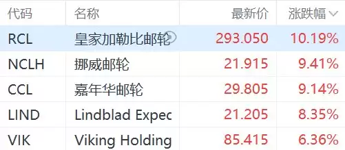 具体来看,皇家加勒比邮轮一马当先,股价涨幅直接冲破了10%的关口。紧随其后的嘉年华邮轮和挪威邮轮也不甘示弱,双双录得超过9%的显著上涨。就连Viking Holdings也表现不俗,涨幅稳稳站在6%以上。
