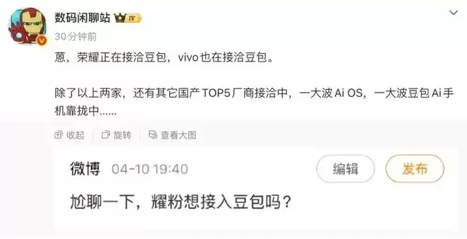 参考同一位博主的消息,“荣耀正在接洽豆包,vivo也在接洽豆包。除了以上两家,还有其它国产TOP5厂商接洽中,一大波Ai OS,一大波豆包Ai手机靠拢中……”。由此可见,荣耀和vivo都在推进与豆包的合作,后续很可能推出相关AI增强产品。而且,有意入局的恐怕不止这两家。