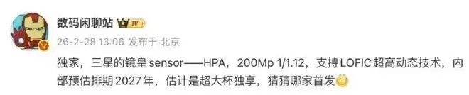 在核心规格之外,影像系统也有重磅升级。根据@数码闲聊站的另一则爆料,三星那颗镜皇级别的传感器——HPA(200Mp 1/1.12英寸,支持LOFIC超高动态技术),内部预估排期在2027年,并且很可能由“超大杯”旗舰独占。结合产品节奏推测,这款顶级传感器极有可能出现在vivo下一代的超大杯旗舰上,无论是叫vivo X400 Ultra还是vivo X500 Ultra。