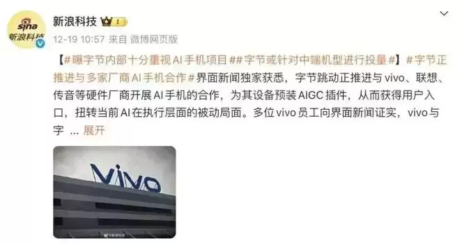 事实上,这场合作早有端倪。新浪科技在去年12月的一份报道中就曾指出:“字节跳动正推进与vivo、联想、传音等硬件厂商开展AI手机的合作,为其设备预装AIGC插件,从而获得用户入口,扭转当前AI在执行层面的被动局面。”报道中还提到,多位vivo员工已向媒体证实,vivo与字节跳动的合作已经确认,双方正在讨论具体细节。