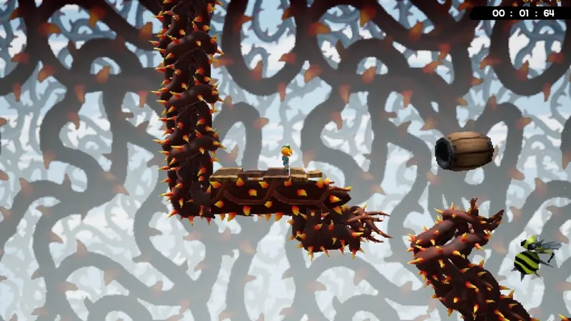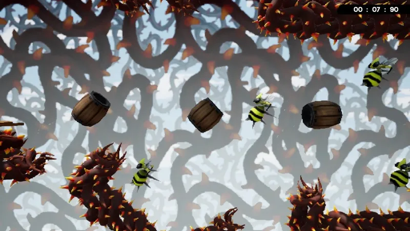 值得庆幸的是,木桶的弹射角度和力量都是预先设定好的,无需玩家手动控制。你需要集中精力做好一件事:把握最佳的弹射时机。沿途务必避开尖刺和蜜蜂的威胁,触碰到它们便会失败。实际上,只要保持耐心,观察并适应节奏,通过此关并非难事。