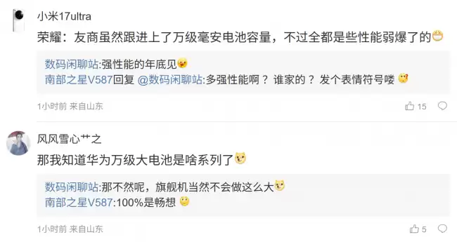 爆料一出,评论区立刻热闹起来。有网友调侃道:“荣耀:友商虽然跟进上了万级毫安电池容量,不过全都是些性能弱爆了的”。博主对此的回复很干脆:“强性能的年底见”。另一名用户则猜测:“那我知道华 为万级大电池是啥系列了”,博主意味深长地回复:“那不然呢,旗舰机当然不会做这么大”。这几番对话,似乎又暗示了更多产品规划的线索。