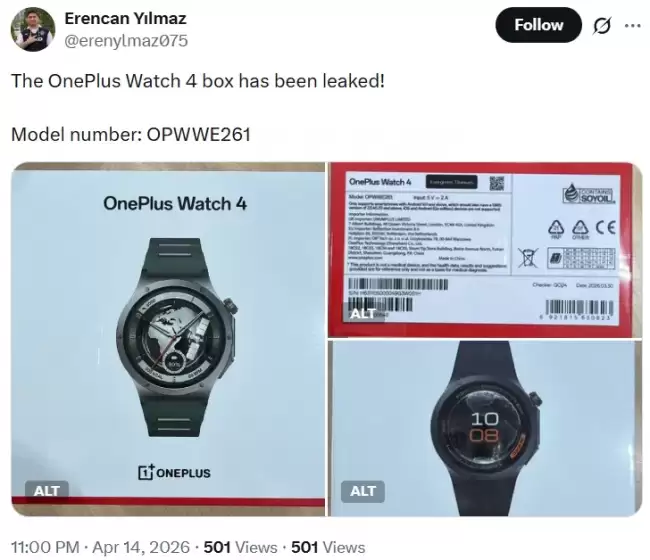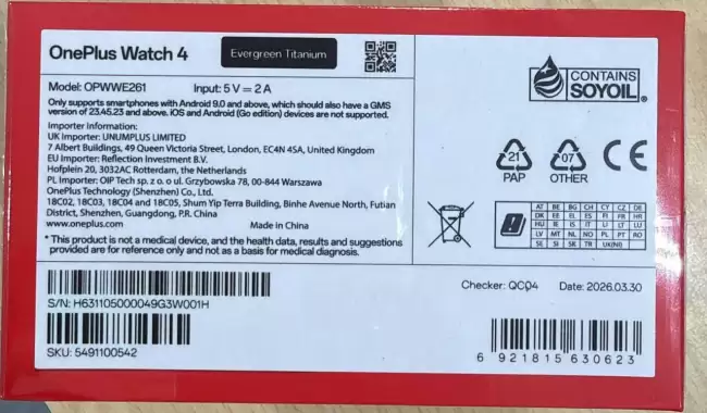 近日,消息源 @erenylmaz075 在 X 平台分享了一组产品包装图片,主角正是备受关注的一加 Watch 4。包装信息明确显示,这款智能手表的型号为 OPWWE261。