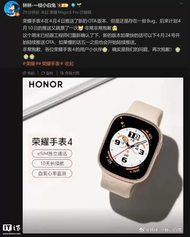 事情是这样的:此前,这款手表在4月初进行过一次版本推送,但随后发现了一些需要修复的问题。原定于4月10日的后续更新也因此推迟,对于这次跳票,官方态度明确,直接表示了歉意,承认是自身的问题。