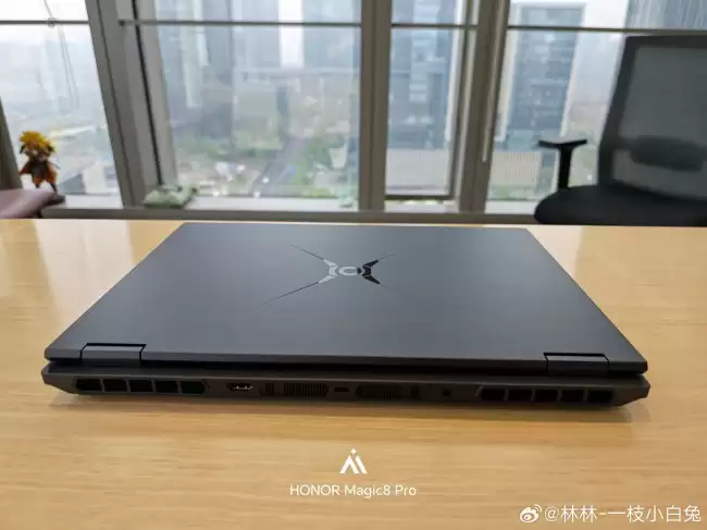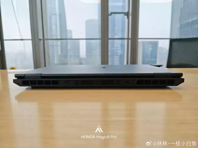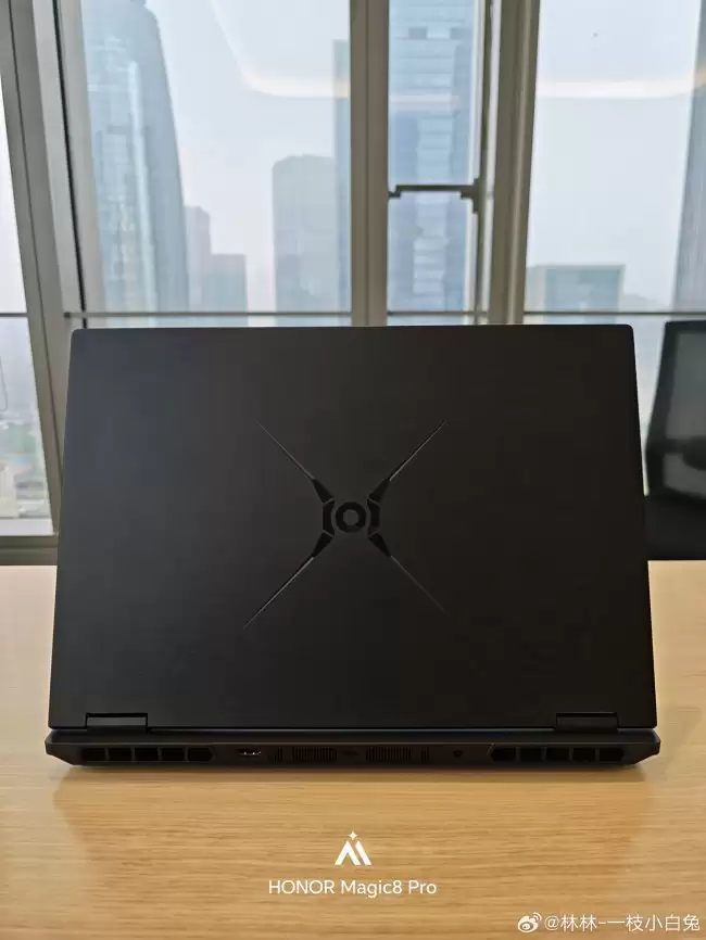 从曝光的图片来看,这款机器采用了经典的黑色“黑武士”设计语言。A面中央同样镶嵌着荣耀猎人的品牌LOGO,整体风格硬朗、沉稳。与H9版本相比,它去掉了标志性的尾喷灯效和四风扇布局,外观上更偏向于传统游戏本的务实风格。