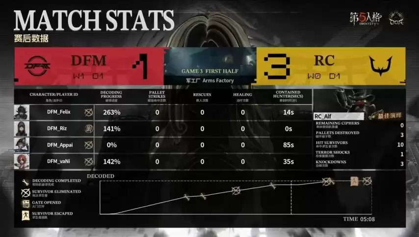 决胜局上半轮,DFM求生者派出飞行家、佣兵、火灾调查员和弓箭手的阵容(禁用了“跛脚羊”和“台球手”);RC监管者Alf则拿出了控场能力极强的邦邦。(禁用了先知、机械师、空军和“逃脱大师”)