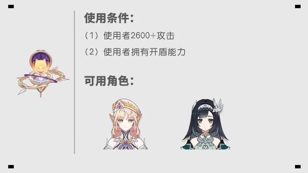 使用条件非常明确:角色必须同时具备“开启护盾的能力”与“堆叠高攻击力的属性”。经过计算,要想吃满26%的增伤上限,佩戴者的攻击力需要达到2600点。