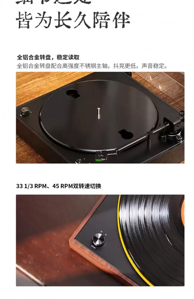 连接方式的多样化,是TT11另一个值得关注的亮点。它内置了蓝牙发射芯片,这意味着你可以直接连接蓝牙耳机或音箱,瞬间将传统黑胶与现代无线音频设备打通。对于桌面空间有限,或者想追求更简洁摆放方式的用户来说,这无疑是个加分项。