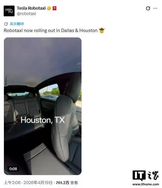 特斯拉Robotaxi版图再扩张:达拉斯与休斯顿正式入列 特斯拉的无人驾驶出租车服务,又向前迈出了一步。就在近日,公司通过社交媒体宣布,其Robotaxi服务正式拓展至美国得克萨斯州的达拉斯和休斯顿两市。 官方的发布相当简洁,只有一句话:“Robotaxi现已在达拉斯和休斯顿推出”。不过,随文附上的