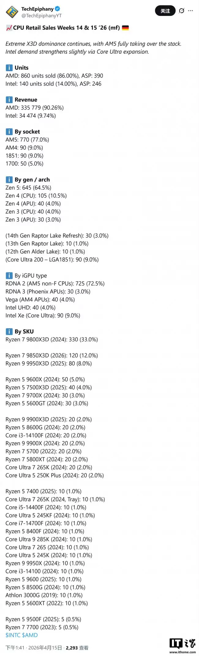 具体到数字上,这两周的市场表现可谓“冰火两重天”。AMD的Ryzen系列CPU总共卖出了860颗,平均售价(ASP)维持在390欧元的高位;而Intel这边,销量仅为140颗,平均售价为246欧元。如果从销售额,也就是真金白银的营收角度来看,差距就更大了:AMD一家就占据了总收入的90.26%,Intel则只分到了9.74%。
