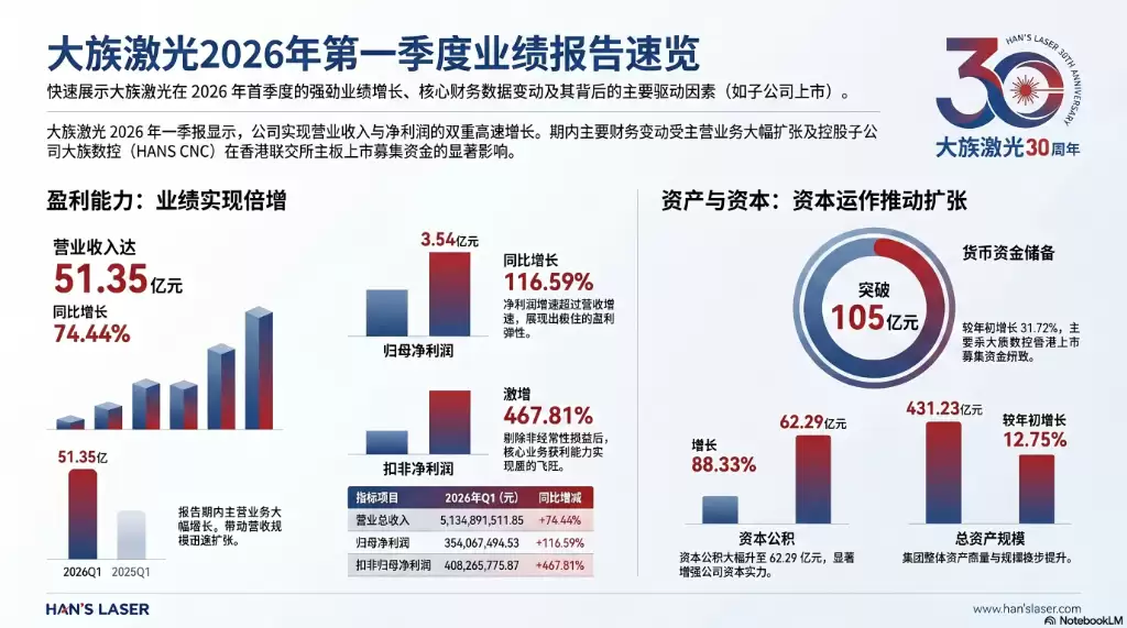 大族激光2026年第一季度交出了一份相当亮眼的成绩单。其主营业务正处于高速扩张期,而控股子公司大族数控成功登陆港交所的资本效应,更是为这份财报添上了浓墨重彩的一笔。两者叠加,共同推动公司的核心财务指标实现了大幅跃升。