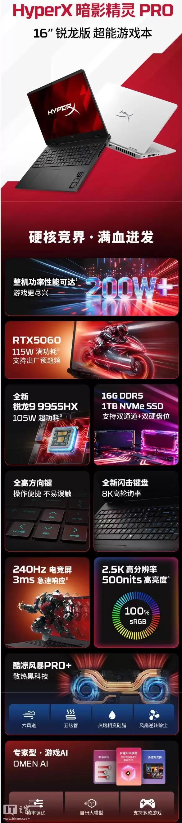 对于AMD 忠实粉丝、专业电竞玩家、多核创作用户而言,2026年 RTX 50 系游戏本市场一直存在核心痛点:一线品牌 AMD 旗舰机型稀缺、小尺寸机身难稳住满血性能、处理器缓存优势无法完全释放。作为 2026 年 AMD 平台重磅机型,HyperX 暗影精灵 PRO 16 锐龙版 超能游戏本搭载锐