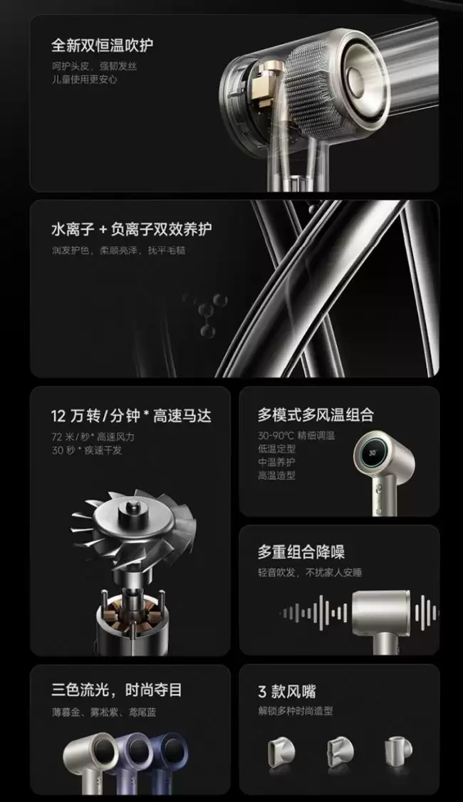 功能方面,它主打的是“双恒温护头皮”模式。关键在于,机器内置了一颗TOF传感器。这颗传感器能实时监测你的头皮与出风口之间的距离,从而自动将风温调控在预设的安全区间内,避免过热损伤。同时,它还搭载了水离子技术,官方称其有助于改善头皮微生态的平衡。