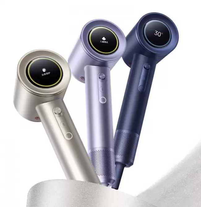 外观上,这款吹风机提供了薄暮金、雾凇紫和鸢尾蓝三种配色可选。它采用了金属珠光漆机身,质感上了一个台阶。机身正面配备了一块彩色屏幕,而握柄处则是一个铝合金材质的调温旋钮,这些细节共同营造出不错的整体质感。