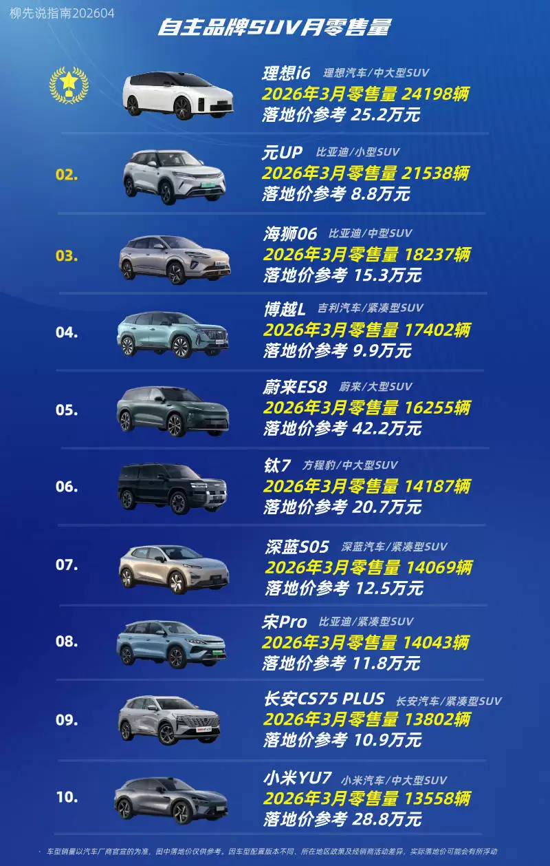 2026年3月国产SUV格局生变:理想i6首登顶,自主品牌多强争霸