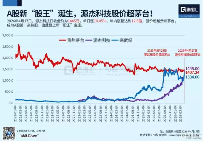 本文约稿作者 | 弗雷迪 数据支持 | 勾股大数据(www gogudata com) 历史性的一幕再次上演,A股的“股王”宝座又一次易主。 光通信领域的佼佼者源杰科技昨日大涨10 5%,收盘价定格在1445元 股,一举超越贵州茅台,成为A股市场股价最高的公司。与此同时,茅台股价收跌3 8%,报14