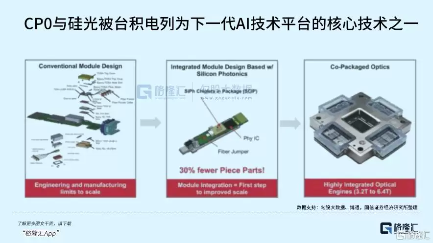 在传统架构中,交换芯片与光模块是分离的,数据需要经过较长的电路板铜线传输,这好比货物从工厂运到港口,必须穿越拥堵的城市道路。而CPO技术则将光学引擎与交换芯片集成在同一封装内,相当于把工厂和港口一体化建设,大幅缩短了“运输”距离。