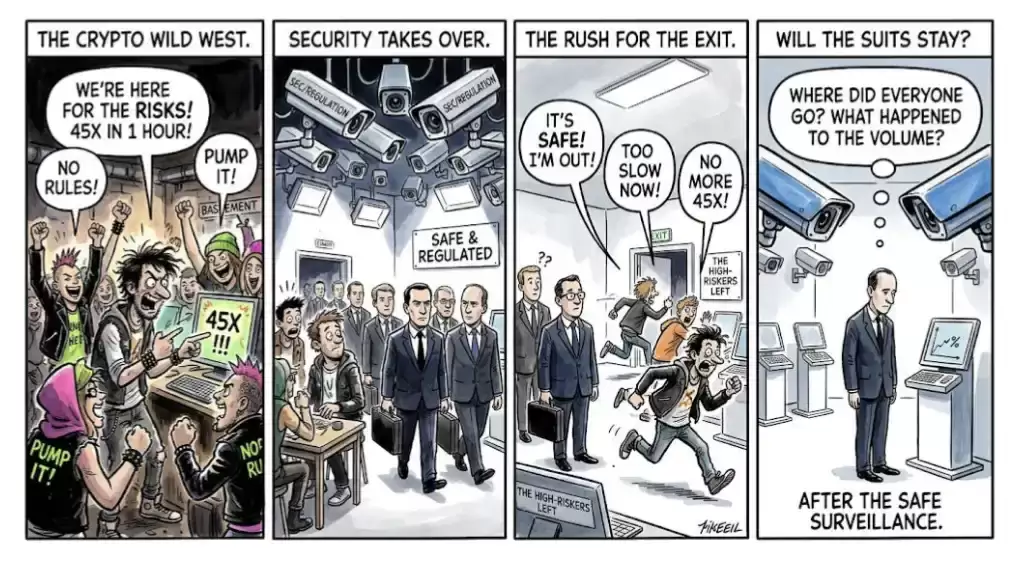 第四格:机构留下,但市场冷清(Will the suits stay?)西装革履的人(机构)站在一个「安全但冷清」的市场里问:「人都去哪了?交易量呢?」意味着市场变安全了,但流动性和活跃度反而下降。