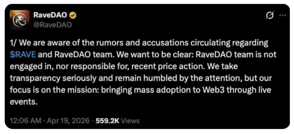 这是一条来自 Ra veDAO 的声明。项目方表示已注意到围绕 $RA VE 和团队的各种传言与指控,并明确否认参与或对近期价格波动负责。同时强调他们重视透明度,对关注表示谦逊,但当前重点仍是推进其使命——通过线下活动推动 Web3 的大规模采用。