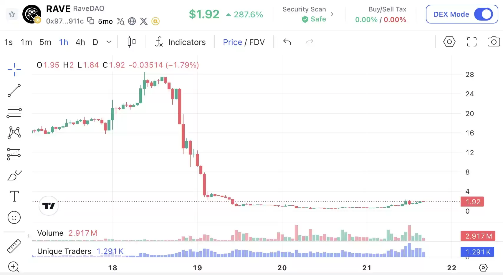 随着交易平台调查的启动,$RA VE价格从26美元断崖式跌至1美元,跌幅高达90%,单日蒸发约57亿美元市值。Ra veDAO随后发布声明,否认团队参与其中。