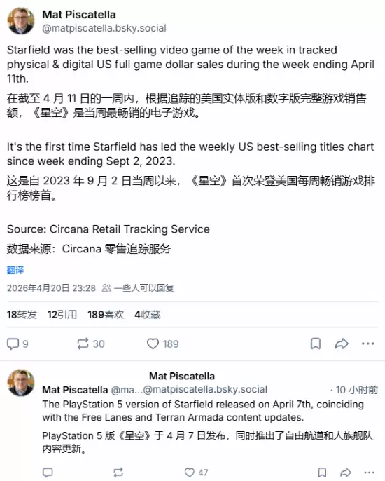 近期游戏市场传来一则引人关注的消息:根据知名市场调研机构Circana高级总监Mat Piscatella在社交平台BlueSky上披露的数据,贝塞斯达(Bethesda)旗下备受瞩目的太空题材角色扮演游戏《星空》,于4月7日正式登陆索尼PS5平台并同步推出全新DLC《破碎空间》后,迅速登顶了截至4月11日当周的美国全平台游戏销售额排行榜榜首。这一成绩颇具分析价值,因为这是《星空》自2023年9月首发当周之后,时隔近三年,首次重返周销量冠军宝座,标志着其市场表现迎来一个显著的转折点。