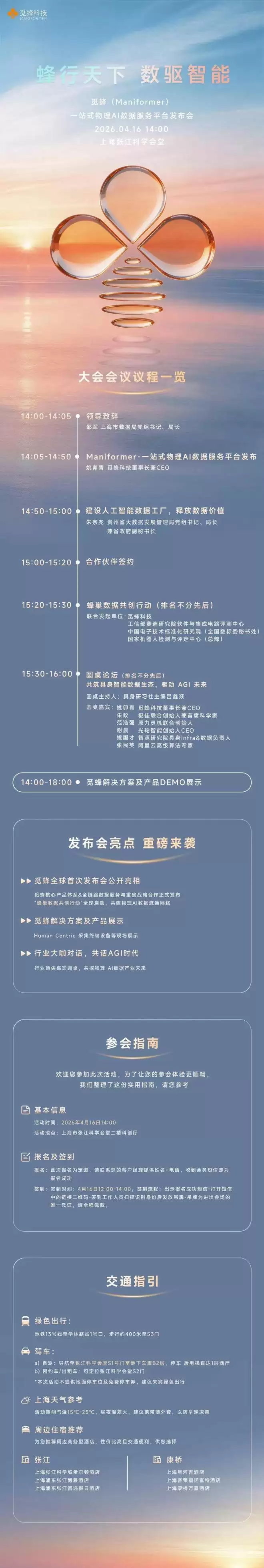 正是在这一背景下,行业的目光开始聚焦于数据侧的破局者。觅蜂科技(Maniformer)近日宣布,将于2026年4月16日在上海张江科学会堂,正式发布其一站式物理AI数据服务平台。这不仅仅是一场产品亮相,更可以看作是对整个行业迫切需求的一次系统性回应:面向物理世界的下一代数据基础设施,究竟该如何构建?
