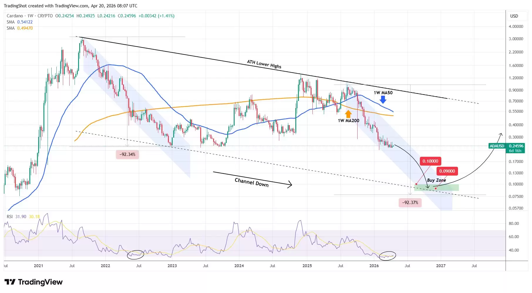 - 从当前下跌通道的峰值1.02美元算起,ADA已回撤了75.5%,现价约为0.249美元。