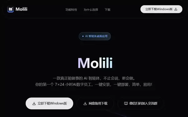 第一步,访问OpenClaw中文版Molili官网,选择对应你电脑系统的客户端下载。