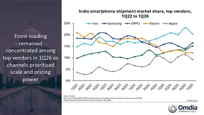 Omdia:印度2026Q1智能手机出货量下滑5%,OPPO逆势增长21%