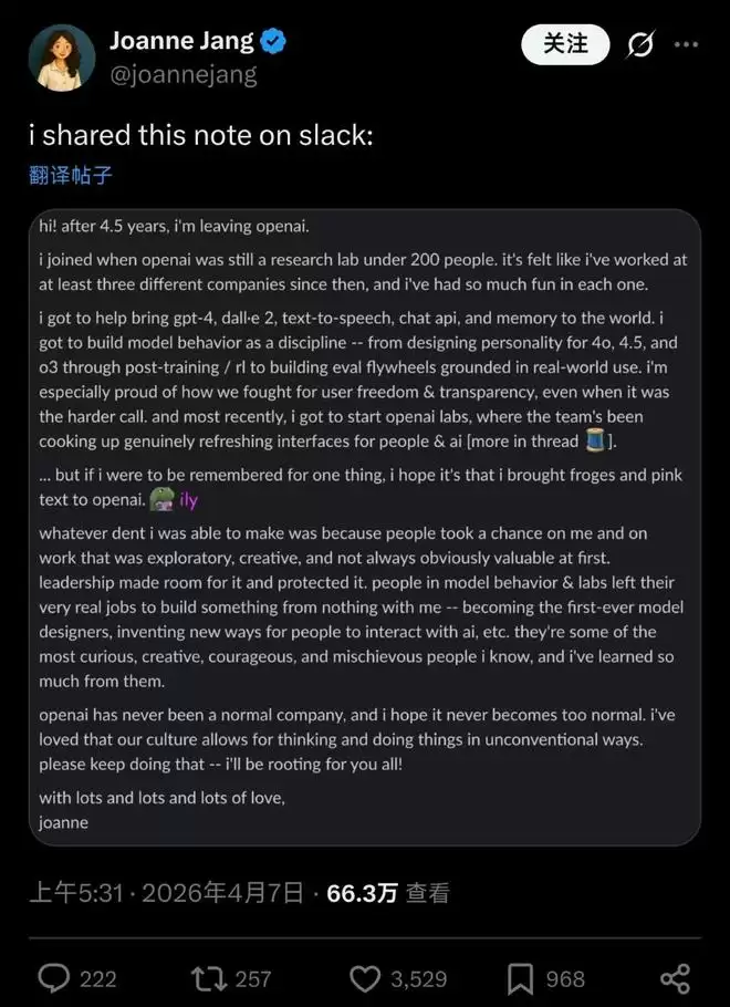 又一则重磅人事变动震动了AI圈。4月7日,被称为“GPT-4o之母”的Joanne Jang正式宣布,将离开她任职四年半的OpenAI。她身上的头衔分量十足:不仅是OpenAI模型行为(Model Beha vior)领域的创始负责人,还兼任OpenAI Labs总经理。关于离职的具体原因和未来去向,她并未明确说明,但留下了一个引人关注的线索:她将在社交平台X上,逐步披露OpenAI Labs正在打造的“人机交互界面”的更多进展。