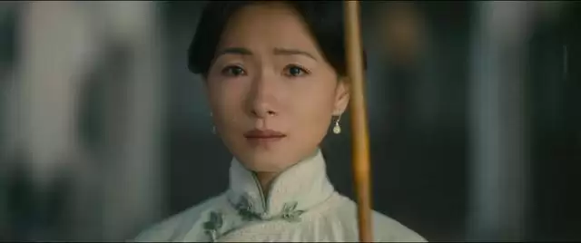 丁玉娇与张云魁的战地爱情也充满了诗意留白。一场雨中送别戏,全程没有一句台词。丁玉娇怀揣蚕豆追寻丈夫,淅沥雨声与渐急的配乐中,马蹄声由远及近。两人于马上马下隔空相望,唯有眼神交汇与一抹微笑。待马蹄声远去,伞沿一滴清泪悄然滑落。这种“此时无声胜有声”的处理,极致地体现了中式浪漫的含蓄之美,承载了家国大义下汹涌的情感暗流。