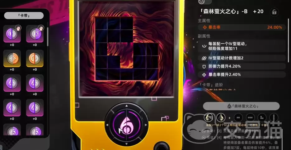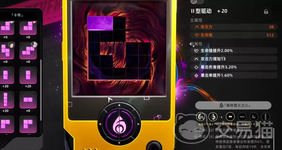 成功配对卡带仅是完成了基础搭建。接下来,你需要重点关注界面右下角那个类似拼图的网格区域。除了左右卡带,你必须在此处嵌入四个名为“驱动块”的组件(即空幕的上半区域)。驱动块的放置并非随意,其类型、数量及具体位置,都必须严格符合当前卡带所指定的套装要求。只有当所有驱动块的配置完全达标时,右下角的套装标识才会由灰色变为亮起,这标志着套装效果已被成功“激活”,空幕的核心能力得以释放。
