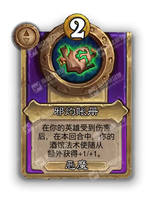 那么,这本邪能账册究竟能为你带来何种实战收益?其核心效果描述为:**“在你的英雄受到伤害后,在本回合中,你的酒馆法术使随从额外获得+1/+1。”**