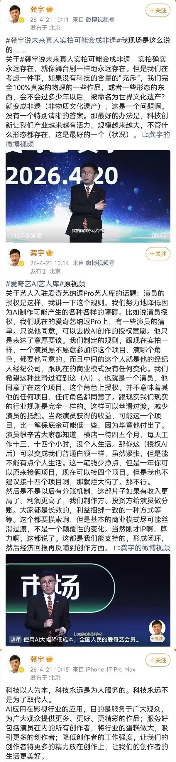 爱奇艺CEO连发三文回应:科技不会取代人 4月21日,爱奇艺创始人兼CEO龚宇在2026爱奇艺世界大会的创投会议上,明确表达了一个核心观点:“科技不会取代人。” 就在同一天,他通过个人微博连续发布三条内容,直接回应了近期围绕“爱奇艺AI艺人库”以及“未来真人实拍可能会成为非遗”等话题所产生的广泛争议