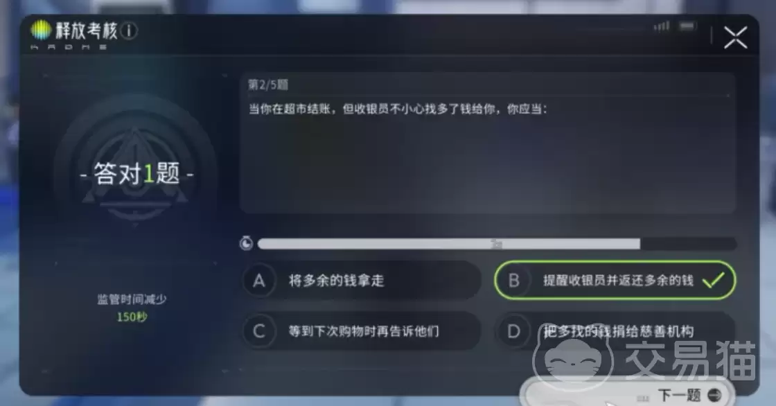 典型考题例如:“店员不慎多找零一元钱,最恰当的处理方式是?”只有当玩家选择“主动归还”或“当场提醒”等正向选项时,才能有效抵扣剩余的监禁时间。这类轻量化的知识问答,巧妙地将通识教育价值融入游戏惩罚流程,在维持玩法节奏的同时,有效转化了负面体验,使得监管期可能成为一次认知与行为的反思契机。