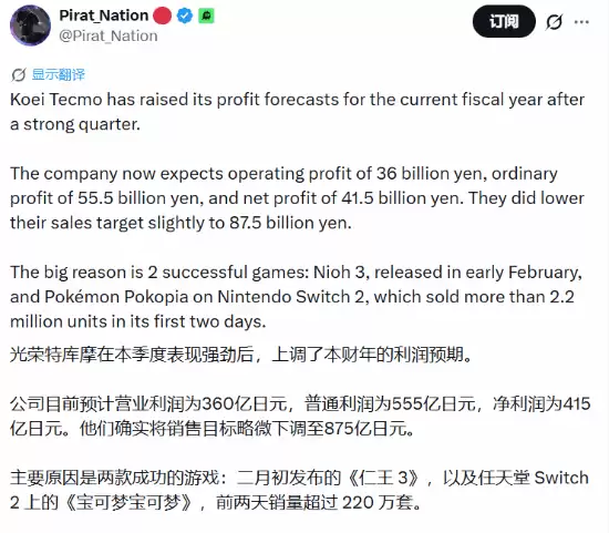 最近游戏圈有个值得关注的消息:根据知名游戏博主@Pirat_Nation的分享,光荣特库摩在上一季度交出亮眼成绩单后,正式宣布上调了整个财年的利润预期。