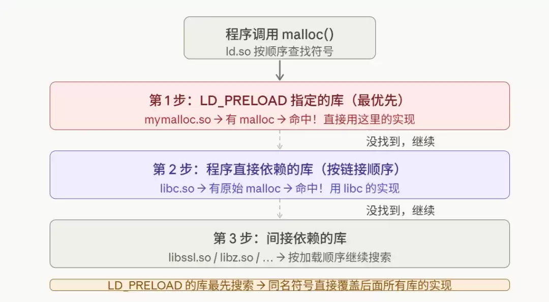 LD_PRELOAD环境变量允许你在所有其他库之前,加载一个指定的.so文件。由于动态链接器查找符号遵循“先到先得”的原则,LD_PRELOAD库里的函数可以覆盖掉后续任何库中的同名函数——包括C标准库libc里的malloc、free、printf。