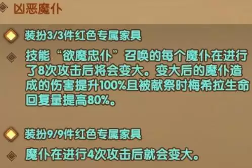 这里有个显示上的小问题:当角色受到致命伤害时,只会消耗一个魔仆并回复25%最大生命值,但头顶的魔仆图标会全部消失,让人误以为其他魔仆也失效了。实际上,剩下的魔仆会依次触发,在后续受到致命伤害时分别生效。每次触发都会消耗一个魔仆并回血,但技能启动后就不会再生成新的魔仆了,相关的家具增益效果也会随之停止。