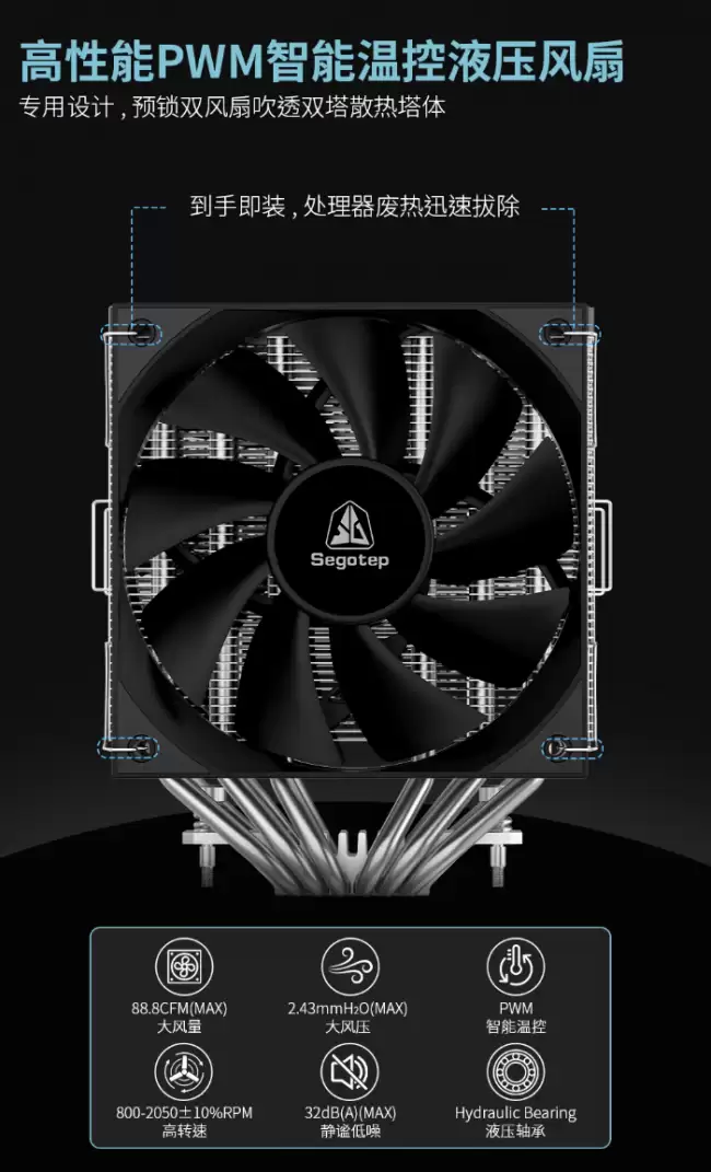 散热风扇方面,产品标配一把120mm尺寸的液压轴承静音风扇。该风扇最高转速可达2050±10% RPM,能提供最大88.8 CFM的风量以及2.43 mmAq的风压,足以吹透密集的双塔鳍片。同时,其满载运行噪音控制在32 dB(A)以内,在保证散热效能的同时兼顾了静音体验。