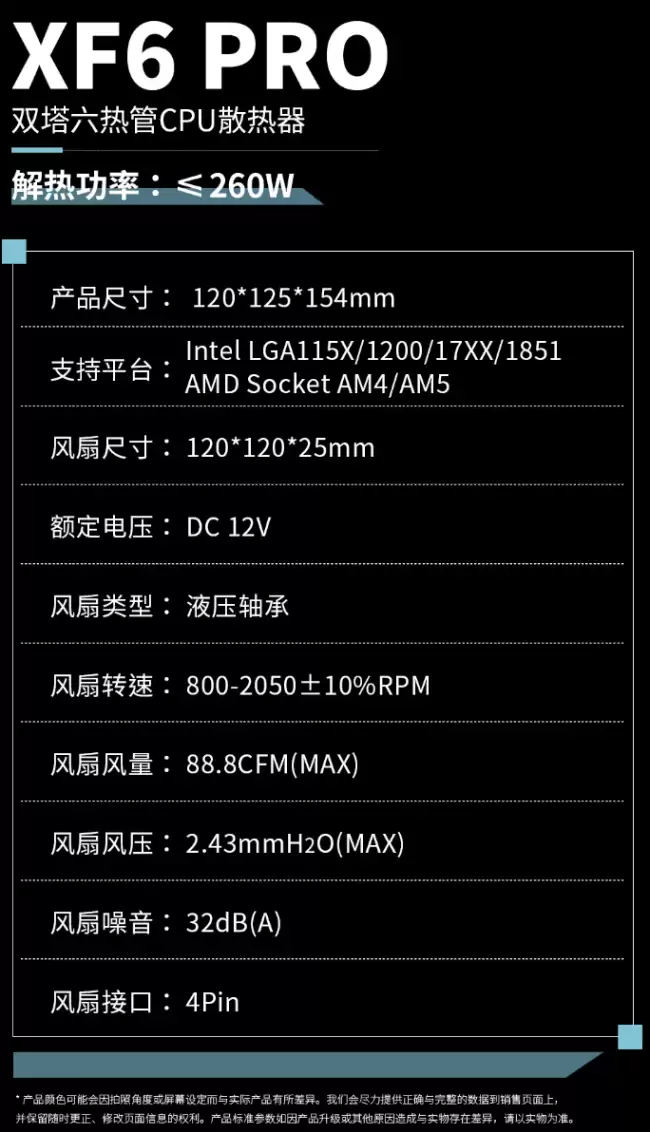 以下是鑫谷XF6PR0双塔散热器的详细规格参数表,方便您在选购时进行参考与对比: