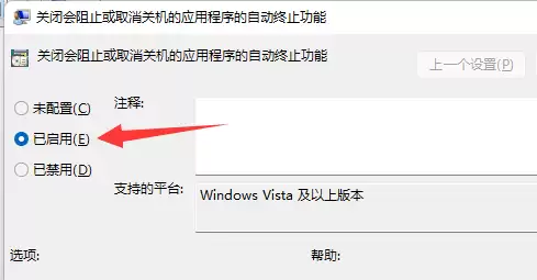 6. 最后一步,在弹出的设置窗口中,将左上角的选项从“未配置”或“已禁用”更改为“已启用”。然后点击下方的“应用”和“确定”按钮保存设置。这样一来,下次再关机时,如果遇到有程序阻拦,Windows就会自动终止它,而不再弹出提示来打扰你了。