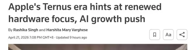 【环球网科技综合报道】4月22日消息,据路透社报道,分析师表示,任命长期担任硬件主管的约翰·特努斯为首席执行官,标志着该公司重新重视其在设备方面的核心优势,并专注于将人工智能功能融入现有产品以维持增长。