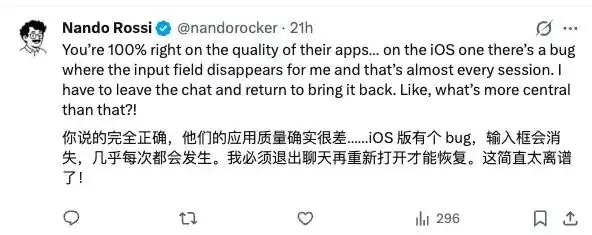 Theo 在体验后评论道:“我很难相信那些声称已经使用这个应用好几周的人,真的用它进行过严肃的开发工作。我甚至还没开始用它修改代码,就已经连续遇到了五六个这样的 Bug,体验令人沮丧。”