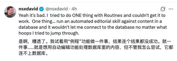 另一个关键问题是,一些本应最能体现 AI 编程效率优势的自动化功能,其自身稳定性就令人担忧。例如,有用户尝试使用 Routines 功能运行一个简单的数据库内容处理流程,结果无论如何配置,始终无法成功建立数据库连接。