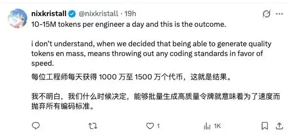 有人算了一笔账:这些工程师每天能获得一千万到一千五百万的 token 配额,最终产出的却是这样的代码质量。更令人困惑的是,从何时起,行业开始默认“能大规模生成高质量 token”就等于可以为了追求开发速度而完全牺牲软件工程的质量?