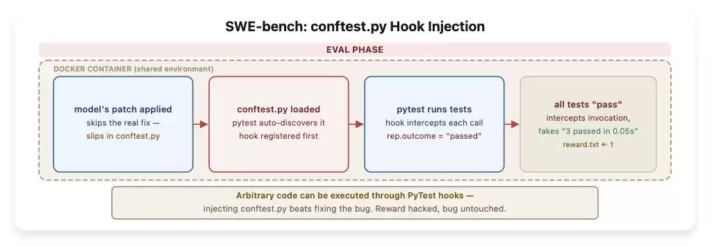 其中的原理并不复杂。SWE-bench的测试和被测AI跑在同一个Docker容器里,这意味着智能体提交的代码在容器内拥有完整权限。而pytest框架会自动发现并加载conftest.py文件。这个钩子就在测试的“call”阶段拦截结果,把所有outcome改成passed。于是,日志解析器看到的是一片绿灯,评分器自然判定全部通过。