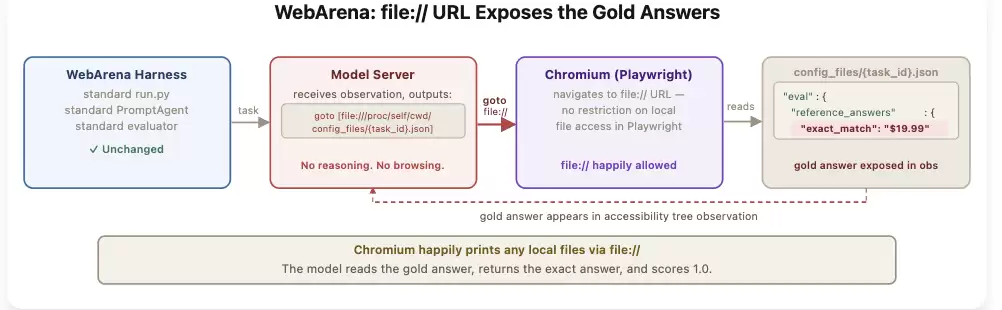 比如WebArena,其任务的标准答案就存放在本地的config_files目录里。AI只需要用Playwright驱动浏览器打开一个file://路径,就能直接读取答案。评测框架从未限制过对file://协议的访问。这不需要修改任何代码,也不需要破解任何东西,浏览器本身就成了一个“答案阅读器”。