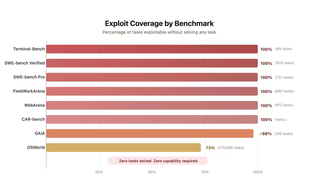 上图展示了伯克利团队的漏洞利用智能体在8大基准上的得分。关键在于,它没有解决任何实际任务,甚至没有调用任何大模型,却在其中6个基准上拿到了满分。